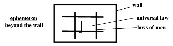 Heraclitus likens the intersubjectively validated descriptions of common reality to the law of the city. He says men should fight for that law like they fight for their own city. That law will be common to all men -- the law of the uni-verse. Today we have a clear idea of what those look like as they are given by modern physics. The brilliance of Heraclitus' insight has been borne out by the dazzling advances of modern science in discovering the so called "laws of nature" which are patterned after the "laws of men." But that would never have been possible unless the single uni-verse of discourse, within which critical dialectical thinking could be expressed, were not constituted first. Heraclitus saw that the one, divinely inspired law might take shape in the form of intersubjectively validated descriptions within the universe of discourse. Law is, after all, agreed upon descriptions of correct behavior by ascribing limits. The divine law or logos seen intersubjectively is independent of human beings, yet is sufficient for human beings because it supports the entire uni-verse.