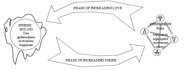 There are thus two great alternations in the life of the world. First there is the major alternation between one and many, rest and movement. Secondly there is the minor alternation within the period of movement and plurality. This is the alternation between the world of increasing Strife which leads away form the Sphere, and the world of increasing Love which leads back to the Sphere.
