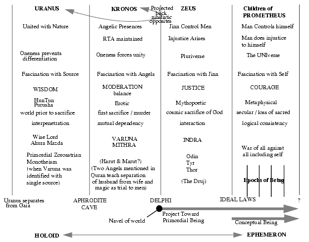 In the era of Aprhodite, man has become separate form nature -- but only just barely. In this separation, what man experiences is the angelic aspect of existence. The intensity of the grounding of man to earth by eros is balanced by the direct experience of Angelic realities that move all of nature. In the reign of Uranus (related entomologically to VARUNA), men are completely animals themselves with no separation whatsoever. With no separation they cannot perceive angelic energies that course though nature. Eros grounds man who lives in a cosmos surging with angelic energies. In the reign of Uranus, mankind is totally immersed in the remembrance of the Single Source of all causation like all other animals. In the reign of Kronos, mankind experiences just enough separation to allow him to hear that remembrance of all creation. In order to stop hearing that remembrance, man turns to woman through which he attempts to regain his lost unity with nature. As separation increases, man becomes able to hear the Jinn who also inhabit the pluriverse. In the reign of Zeus, their attention turns from the angelic energies to a fascination with the Jinn. The Jinn convince men that men were created to work for them as the Sumarian myth says. Since the Jinn violate the balance of Rta, mankind, as their servants, learn likewise to violate the cosmic harmony. Finally, men abandon the Jinn and construct the totalitarian uni-verse, stopping up their ears to both the Angelic remembrance of the Single Source and the orders of the Jinn. Man does this by advancing the ideal laws in rational discourse. These stages of human development and the genesis of the Western worldview by stages are very important to understand clearly. The stages of Uranus and Kronos are projected back from the mythopoetic era of Zeus. Thus, they are couched in terms of injustice between the members of the generations. But the possibility of this injustice only arises in the era of Zeus. When men are identical to animals, or immersed in the Angelic energies, there is no possibility of this injustice. There is no possibility for the development of the clinging and craving exemplified by the linguistic project of constructing Being in its primordial form. Only Jinn and Men are free to be unjust. Thus, the development of the concept of Primordial Being probably does not stretch back any further than the beginning of the reign of Zeus. The fact that the Uranus and Kronos stories of injustice are duals, point to the fact that they are reconstructions from the reign of Zeus. The prior epochs are probably common to all the ancient worldviews not unique to the crafty Indo-Europeans. Each epoch traces a further separation from the lost holoidal unity by mankind. Moving back through the stages, one moves toward holoidal unity. Thus, one may say that the differences between the reigns of Uranus and the children of Prometheus is in many ways identical to the difference between the holoidal and the ephemeron.