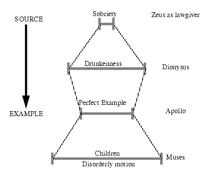Moving from the disorderly motion of children, we attain the perfection of the gifts and skill in young men who know reason. These men, when they get older, are allowed to get drunk and become disorderly like children again, but under the control of the sober. Those who can control themselves in drunkenness are graduated to become mythmakers that generate the lies that the other chorusers sing. We wonder who is the god of these sober ones? It may well be Zeus who is the lawgiver for the mythopoetic era toward whose cave the three elderly speakers are moving. That is Zeus of whom Apollo and Dionysus are aspects. Apollo killed the Python who is an image of the Typhoon that Zeus defeated. Zeus is the Janus faced god which represents the whole of the nihilistic opposites in his manifestations as the light sky and the dark of night. Zeus is the framework that holds the nihilistic opposites apart, keeping them from cancelling and yet together so their manifestation may oscillate between them. The sober ones know the whole of virtue and seek to teach their drunken students that source of all goodness. Thus, there is a relation between the sober knowers of the whole of virtue who have laid hold of the source of the good, and the Perfect Apollian example that exemplifies that good. Between the source and the example lies the artificially induced drunkenness which allows the suppressed variety to surface within the center of the totalitarian uni-verse. This artificial chaos is contrast with the natural variety that occurs in children. The disorderly motion of children is suppressed by the Apollian orderly bright spotlight on perfect examples, for instance at the different games, like the Olympics. The disorderly motion is allowed to surface again in the Dionysian chorus so that change can occur to keep the choral performance interesting. But the sober guardians keep the goal of the good in sight and steer the ship of the city ever onward toward the goal.