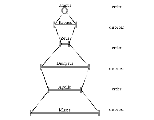 This pattern makes wonder if it is not continued with Zeus being the god of the sober ones, but with this orderliness disordered yet again by Kronos only to be reordered again by Uranus. These successive stages of order and disorder provide a perfect model of a teleonomic system as described by J. Monod in Chance and Necessity. The autopoietic system would appear externally as teleonomic -- that is, moving toward a goal which it does not know itself. The fact that Uranus appears out of the earth like the man of the city is not necessarily an accident. Uranus is the cap of the layers of order and disorder. The mutual injustice of Kronos and Uranus toward their children is equivalent to the lie on which the city is built. They did not believe in retribution in endlesstime, so they were unjust toward their children. Plato asks us to bring retribution into this world to counter this tendency. But it is through the layers of order and disorder that anti-manifestation is controlled and perpetuated with the city which projects its own distorted uni-verse. This is done by forcing the "yang splendor" of Apollo and "closed yin" of Dionysus together and causing them to fuse by layering them together. This mixture of too light and too dark is the essence of anti-manifestation. The teleonomic autopoietic system embodies anti-manifestation which produces overly orderly and overly disorderly states that disturb the natural production of variety.