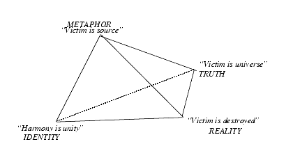 So we are stuck in a worldview with a fundamental flaw; a worldview that believes it can effect sources by manipulating and destroying forms -- perfect forms. It seeks to actualize harmony through destruction which is exactly the opposite of what engenders harmony. One can see quite clearly that the Indo-European worldview seeks to push destruction to the point were it turns into its opposite -- harmony. It attempts to make the cosmic sacrifice in which God (the single source) destroys itself to produce all the myriad sources and forms.1 This re-enactment seeks to effect the ultimate source by an equally sympathetic magic. It is just as flawed to extend this logic of destruction (anti-production) from sources of forms to the single source of all sources. Harmony between forms is not the same as unity of sources. Harmony and unity are two different concepts. The Indo-European worldview mistakenly sees them as the same. Impose unity, and harmony is smothered. Harmony only exists between different complementary entities that resonate. Unity insists on turning the SAME into an identity; a fundamental Indo-European mistake which constructs Being from indentity, reality, truth, and metaphor. Each of these are different views of the same categorical mistake.