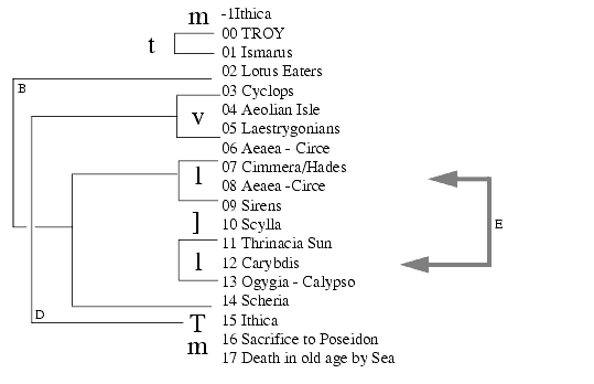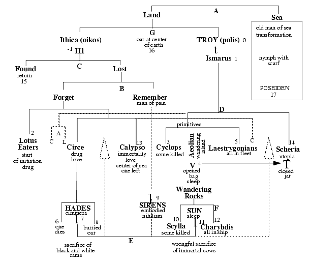The journey of Odysseus from Troy to Ithica and beyond must be seen not in its serial order of presentation, but instead in terms of complementary opposites. He sets out from Troy, and on the way home pays a visit to Ismarus which he sacks because they were allies of the Trojans. Because they did not leave as quickly as they came, there was a battle when the Cicones reinforcements arrived in which the warmongers suffered badly. We already know, although Odysseus does not mention it, that his fleet sided with Menelaus in the argument with Agamemnon, but then turned back again to attempt to rejoin Agamemnon. Thus, we see Odysseus oscillating between the two great leaders of the expedition to Troy, after sacking the city when they began to argue on when was the best time to leave. We note that in the first case Odysseus was on the side of Menelaus who preferred to leave quickly and sacrifice to the Gods later. However, when they sacked Ismarus, Odysseus made the error, or rather did not prevent his men from making the error, of not leaving quickly. Thus, in these actions, we see Odysseus oscillating between two positions, between Menelaus and Agamemnon and between quick and slow departure. In this oscillation between nihilistic opposites, Odysseus gets lost. He is lost in a nihilistic landscape whose nature is defined by the chaos of the sea and the ever present danger of forgetfulness of home. The very first people that Odysseus encounters with his fleet are the Lotus Eaters who make some of his men forget home with their drug. This forgetfulness is embodied in the subsequent episodes with Circe and Calypso. These two nymphs, each in a different way, attempt to make Odysseus forget home. They each amplify the experience he and his men had with the lotus eaters. In order to understand them, we must see them as embodiments of forgetfulness. They stand as guardians of the crucial encounters in Hades and on the Island of Helios which occur between these two limits of forgetfulness. In fact, the whole interpretation of the journey of Odysseus must revolve around these two episodes. They represent the negative fourfold and positive fourfold respectively. One is the realm of intense darkness, and the other the world of intense light. Hades is guarded by Circe and her transforming drug which, when tamed, leads to forgetfulness. The other is guarded by Scilla and Charybdis, the very embodiment of the horns of nihilistic wicked dilemmas. These adventures separate the two extremes in communities -- that of the Cyclops and Scheria. The Cyclopses do not fear Zeus and do not treat strangers according to his law. The Scheria go to the opposite extreme and treat strangers too well for their own good. So we see in the adventures of Odysseus, there are a whole set of nihilistic opposites playing themselves out. The opposites are not one for one. But there are sub-bifurcations even within the opposites. So we see put into play a series of symmetry breakings which produce a nested structure. If we follow the fault lines in these symmetry breakings rather than the story, we get a picture of the inner structure of lostness. One is not lost just anywhere. One is lost in the WORLD. Thus, the structure of lostness in order to be utterly lost must display the structure of the world. One is utterly lost when one wanders the whole world, when one goes to the ends of the earth and even beyond. In order to go beyond the limits of the world, those limits must be delineated. The Odyssey delineates the limits of the world, and thus has relevance for our appreciation of the Indo-European worldview.