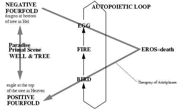 Here we see self-production or autopoiesis specifically called out. And the stages of autopoiesis relates directly to the stages of the theogony of Aristophanes which made us first aware of the negative fourfold and its relation to the positive fourfold. In the theogony, there is an emanation in which first there is an egg formed by transgression of night against covering. Then Eros is born, which uses chaos and the abyss to produce the primal bird, who then gives rise to the other elements of the positive fourfold such as Heaven, Earth, Gods, Men and Ocean. What is added to this picture by the myth of the Phoenix is a connection between the positive and negative fourfolds and the primal scene of Well and Tree. It appears here that the paradise in which the bird dwells is in some sense the point of reversibility between the positive and negative fourfold. We note that the Phoenix sounds much like the eagle that lives in the top of Yaggdrasil which is opposite the serpent or dragon who lives in Hel. Also added by the Phoenix myth is the reversibility between the egg and the bird which is fire. The Phoenix is famous for arising out of fire. The bird goes from the paradise of the primal scene to Syria, a place of trackless deserts. The trackless desert reminds us of nihilism, the situation where one cannot make distinctions or discern tracks. In the midst of the trackless desert is a secret place with a special tree which reaches to heaven. There the bird burns and arises from its own ashes. It is said that the bird does not know Venus in the sense that it does not need sex to produce offspring. It is its own offspring. For it, death is Venus or eros. Thus, here eros appears as the resolution of nihilistic opposites of normal eros, the bittersweet by the opposite of life, i.e. death. Eros appears as Thantos. This is in keeping with the distinction between super/sub-human glory in relation to human glory. Eros transforms into Thantos at the point were it becomes more than human.