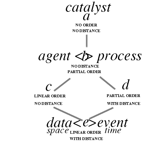 Generally, the less order, the more meaning or significance is attributed to the viewpoint. Thus, the Catalyst viewpoint is the source of all the semantics of the system which is expressed in terms of Autonomy and Function as Linguistic patterns. Full ordering has the least significance. The different ordering characteristic of the viewpoints contribute to the differences between the essential transformations described by sets of these viewpoints.This also explains some of the differences between the five Hsing. Generally, we may associate the three different layers of ordering with the levels of the analogy of the Geode. The Catalyst viewpoint is the cornucopia from which all the possible orders and permutations of the possible configurations of the system unfold, so it is related to the empty core of the Geode. The Function and Agent viewpoints are related to the crystalline structure of the Geode. The Event and Data viewpoints are related to the surface of the Geode. The Geode is the analogy for the meaning structure of things where everything with meaning is seen as empty. The Catalyst viewpoint represents a positive view of the essence of manifestation. When we view the essence of manifestation not as a blackhole but as a white hole or source of forms within the world, then we get a picture of what the Catalyst viewpoint is all about. The outer layer of things is their spacetime/timespace organization. The structuring of things relates to their embodiment of autonomy and intentionality from a human perspective. The ability to make distinctions characterizes the Catalyst viewpoint. These distinctions are the source of the semantics in the system and the selector of the specific forms out of the myriad possibilities may arise from the cornucopia of the sources of the system. The Catalyst viewpoint is what drives the form of the system in a particular direction in its embodiment of Autonomy and Intentionality in the spacetime continuum. The Catalyst viewpoint gives that specific embodiment its semantics through its relation to all other possible structures and forms.