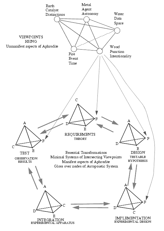 The realization that these essential transformations may be produced by permuting five viewpoints, and that these viewpoints are equivalent to the five Hsing which the Chinese have isolated as their major categories for understanding the world, was a major step forward because it finally made the five Hsing comprehensible and showed how the pentahedron of four dimensional space articulates both the five viewpoints and the five essential transformations. The pentahedron in four dimensional space has been clearly the form on which the five Hsing was based ever since it was realized many years ago that the pentahedron were two intertwined mobius strips. These intertwined mobius strips have exactly the same relationship with each other as the production and control cycles that appear in the Chinese theoretical constructs out of 32 permuted possibilities. What was new in my thinking was the fact that the pentahedron's five tetrahedrons were defined by permutations of the Hsing (viewpoints), and that these tetrahedrons were the five essential transformations which form autopoietic rings like those that occur in software engineering. This finally related the five Hsing to elements that could be seen as important from the perspective of general systems theory such as that of George Klir. Here, for the first time, East met West in a compelling connection between basic theoretical structures. We see here how viewpoints are connected to the minimal systems of essential transformations. Viewpoints are the duals of the essential transformations which are generated out of the permutations of the viewpoints. From each viewpoint, some specific aspect of the system being viewed is seen. Other aspects not associated with that viewpoint only appear when we change to other viewpoints. Any higher dimensional Platonic hyper solid simplex may produce a similar structure, and we may hypothesize that more complex autopoietic rings are the embodiments of these hyper simplexes. The pentahedron with five viewpoints and five essential transformations represented by minimal systems (tetrahedrons) is merely the simplest possible of all these structures, and therefore will here represent the class.