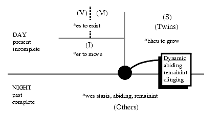 The past tense is expressed using the root WESAN. The preterite is a past without a corresponding future tense. Thus, the past tense has the implication of completion, whereas the present tense, as the incomplete, is a combination of all three other roots. However, the root BEON, which has to do with growth and becoming, dominates as providing one full set of conjugations of the verb. The other set of conjunctions is composed of the *er root in the form of erat, and the *es root in the form of eom, is and sud. The blending of two roots in one set of conjunctions shows the tempering of the existence of the *es by a root meaning to move which indicated becoming in a way similar to beon. If we were to construct a picture, we would see the past as night and stasis, and the day as growth and movement in the present. The day is the specious present in which becoming happens while the night men rest and thus stay themselves until daybreak again. The combination of the *es and *er roots signify to exist and move, whereas the parallel *bheu means to grow.