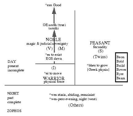 When we look at the structure of our Indo-European roots which combine to make the verb "to be," we see a striking parallel of the day side and its three roots with the social functions described by Dumazil. This indicates that these roots were not picked at random to combine into the developing artificial verb "to be" which gave rise to Primordial Being. This bears out our proposition that the cracks in Being are significant, not merely random crevices. Even if the nature of the cracks are VOID ultimately, there is still the fact that each crack is also a relation between those different sorts of Being that appear on either side. In this case, each crack is a relation between the four base roots out of which artificial Prehistorical Being is forged. We need to look more deeply into this matter of the connection between the cracks in Being and original Indo-European mythology.