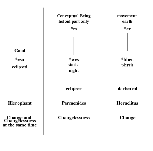 Notice that the Greek verb for Being centers around the highest subroot *es in which it gathers three meanings related to reality, truth and identity. Note also that the "to move" subroot *er, if seen opposite to the *bheu subroot, could be seen to relate to the basic dichotomy of the metaphysical era between the Arche and the Physis. For Anaxamander and Thales, the Arche was always moving. It is only with Parmenides that the Arche is seen as frozen. * Bheu becomes the word Physis in Greek. This eternal movement of the Arche contrast to the growth and outpouring of the Physis is exactly what is embodied in the metaphysical era. In some ways then, the move from Primordial Being within the Mythopoetic to the Metaphysical can be seen as a move from *es to *er-*bheu. However, *es is itself encompassing three meanings: the real, the true and the one. It is, of course, the *es that Parmenides says is the unmoving one which he tries to reduce to its holoidal element alone. Parmenides forgets or leaves aside the other meanings which make Primordial Being such a rich constellation of concepts. Parmenides confers stasis on the *es which is a property of the *wes. *Wes also has the property of night. Parmenides' static Conceptual Being eclipses the Good. The Good is a root related to *es, namely *esu. It appears that Parmenides, in Conceptual Being, combined *es and *wes which are separated seemingly opposite (from our diagram at least) subroots of Being. The combination of *es and *wes produced the eclipse of *esu: the Good. *Er and *bheu come between *es and *wes. *Er is related to the earth as well as movement. Earth and Physis are closely related in our minds. Thus, it appears that Parmenides really accomplishes a reconfiguration of the subroots.