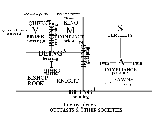 Seen from the point of view of the warriors, the interfaces can be expressed in terms of pointing the weapons at the enemy, grasping the source of the primary resource of fertility, and bearing the burdens of supporting the sovereign and the priesthood. From the point of view of the internally colonized, the outcasts are pointed at and ridiculed by the Asvin who are at least considered part of society. They must deal with the greed and grasping which is their experience of the exploiting upper classes. Concomitantly, they must deal with their own powerlessness and inability to take control of their own destiny. Grasping is the one way (intransitive relation) as are indeed pointing, bearing and enveloping. All of these intransitive relations between signifiers are dualistic power relations. As in the chess game, these are the different kinds of power which are exercised together in a concerted fashion.