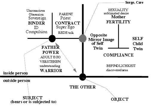 This model is the original pattern which the lost pattern covers over and embodies at the same time. It is seen in the Primal Scene and in the permutation of opposites that make up Primordial Being. It is the clear image of existence that occurs in any non-Indo-European languages that lack any concept of Being, such as Arabic and Chinese. This pattern in which no third thing is allowed to arise and in which chaos does not exist, is the clear view of existence as permeated with the void through and through. This clear view has been muddied by the introduction of the THIRD -- Baal/Zeus the covetous one -- who obscures the perfection of existence by the Flotsam and Jetsam of Chaos. Odin, their counterpart, is known as the Third.