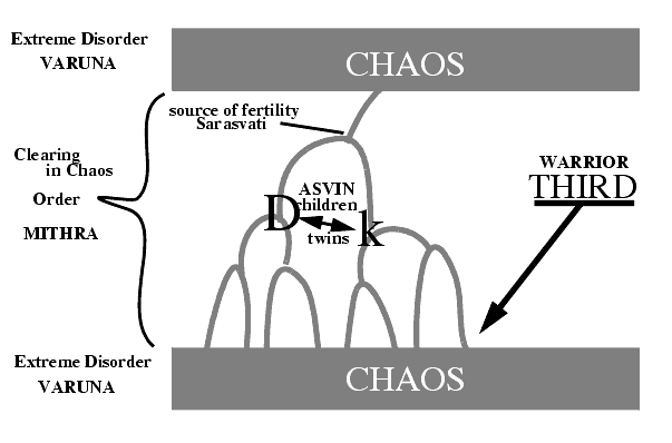 The prime distinction is between the extreme order of bifurcation and the extreme disorder of chaos. This corresponds to the difference between Mithra and Varuna. When chaos occurs, it envelops the realm of order. Within the realm of order, there are three major elements. The source of bifurcation can be seen as being analogous to the principle of fertility. There are the twin system states produced out of this source of fertility corresponding to the Asvin. Finally, there is the third thing which breaks the bifurcation and causes the onset of chaos. There is an isomorphism between the elements involved in the onset of chaos and the signifiers in the lost pattern. This isomorphism is significant as it shows that the lost pattern comes from an insight into the nature of dynamical systems. Dynamic clinging works because of this basis on this insight. It shows that the distinction between the non-agitated and agitated dynamic system is analogous to the boundary of pointing that marks the enemy and outcasts. These others do not know how to use the turbulence of systems. They do not know how to go berserk. The beserker is the warrior who goes into a turbulent state. Such a state occurs when state changes are too fast for the enemy to be able to predict and counter. This frenzy is a state of behavioral consciousness where the human becomes enraged and acts like a bucking bronco on the battlefield. The battlefield itself is a chaotic tangle of bodies bent on destruction. The chaos of war is opposite the state of peace. For the Indo-Europeans, this oscillation between war and peace was part and parcel of everyday life. It was the warrior who made the transition occur and acted as the third thing which precipitated chaos. In peace the center of the world was fertility and children. The children, when twins, symbolized the bifurcation of system states on the way to chaos. Continual bifurcation may be interpreted as population pressures that pushed toward expansion of territory until this resulted in war.
