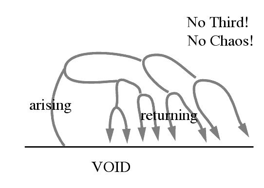 This is the original pattern we see through the window beyond the House of Being. Existents arise directly from the void bifurcate into a play of interacting opposites and return to the void. The void and the interacting play of opposites is the Same. The state of "Both" is interpenetration. The state of "Neither" is out-of-time.