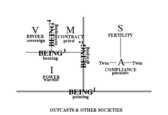 In this view, metalevels of Being are treated as relations between adjacent signifiers. Being,1 as pointing, manifests as the separation between internal and external from a societal point of view. What is external can be isolated and identified. Pointing out can be understood in the sense of targeting and aiming at as with game and the enemy. Outcasts and other societies are perpetually the brunt of aggressive behavior. This is also the border with the region of static clinging or abiding, signified by the root *wes. All others are seen as engaged in static clinging only. They do not understand dynamic clinging as do the Indo-Europeans.