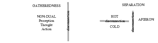 However, because interpenetration/Void is pure emptiness, there is no real connection or merging between the opposites. Likewise, the uncarved block of non-dual ambiguity from which the opposites and Apeiron arise is not a mixture or merging because in this state, none of these signifiers exist per se -- they have not separated off. We extend our logic of disconnection to disconnect non-duality from the state of separation. The state of gathereness is disconnected from separation.
