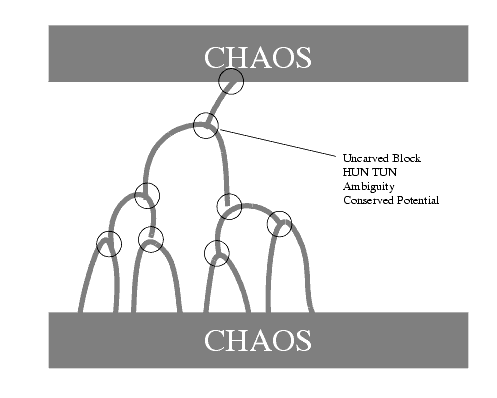 The cosmic sacrifice of the Purusha or Yimi is mirrored in China by the death of Hun Tun who symbolized what is called in the Tao Te Ching "the uncarved block." The uncarved block is the original nature of things before the arising of chaos. The death of Hun Tun is brought about as his "friends" attempt to give him organs to the outside world by cutting him open. This cutting open of the Purusha, or Hun Tun figure, is the work of the warrior or the principle of the `third' which inaugurates the regime of chaos. An excellent study of the mythology of Hun Tun is by N. J. Girardot, called Myth And Meaning In Early Taoism. The only real problem with this study is that Hun Tun is identified with chaos in a non-critical way. We should clearly distinguish between "ambiguity" and "chaos." Chaos is turbulence which occurs when a dynamic system is agitated. The degeneration of the stability of the dynamical system first goes through the steps of bifurcation, and then finally goes into a state of pure chaos, where in any number of confliction states, might be oscillated between. What Girardot calls the Chaos of Hun Tun should be called ambiguity. This ambiguity is noted in the case of the difference between Mithra and Varuna. These two angelic presences are seen within the Vedas to merge together so as to be almost indistinguishable. Antonio T. de Nicolas, in his book Four-dimensional Man: Meditations Through The Rg Veda, points out this phenomenon very clearly and relates it to quantum logic which is the formalization of quantum uncertainty. The ambiguity of the uncarved block is the state in which no form has yet arisen. It is the state of conserved potential out of which many possible forms could arise. This state of conserved potential is the interface between the Void and the first emergence of the dynamical system with a single state from the void.